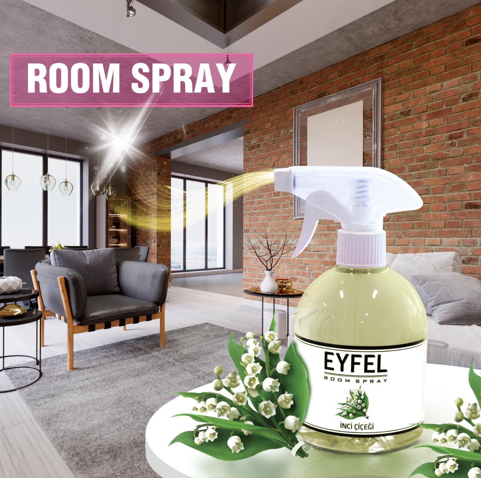 Eyfel Room Spray este un parfum creat special pentru: mobilier tapitat, perdele, mochete-covoare, lenjerii, prosoape, haine curate.